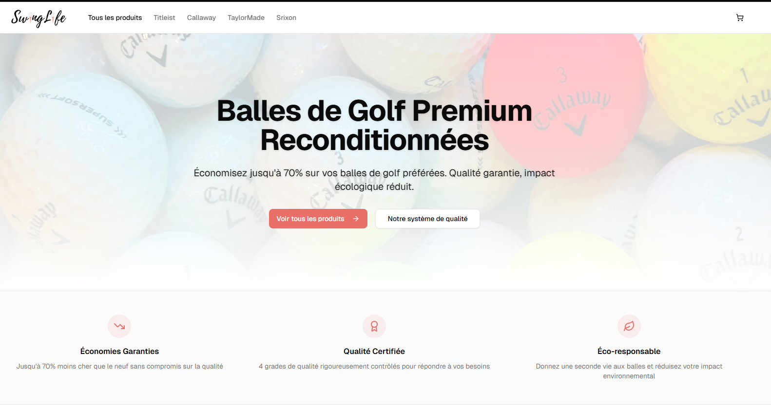 Besoin d'une plateforme e-commerce moderne pour vendre des balles de golf reconditionnées avec une expérience utilisateur fluide et professionnelle.